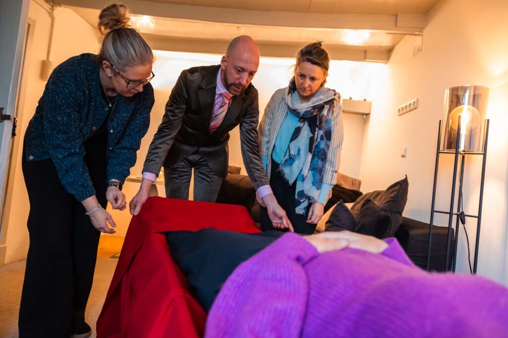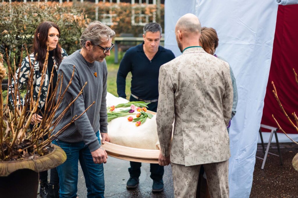 Ik begeleid dit proces graag met jullie. Je maakt deel uit van je eigen rouwverweving, door samen het afscheid vorm te geven. Daarbij kan iedereen zijn of haar eigen talent inzetten: van zelfgeschreven gedichten voordragen tot muziek ten gehore brengen en van koffie inschenken tot een baarplank met lijkwade vervaardigen.
