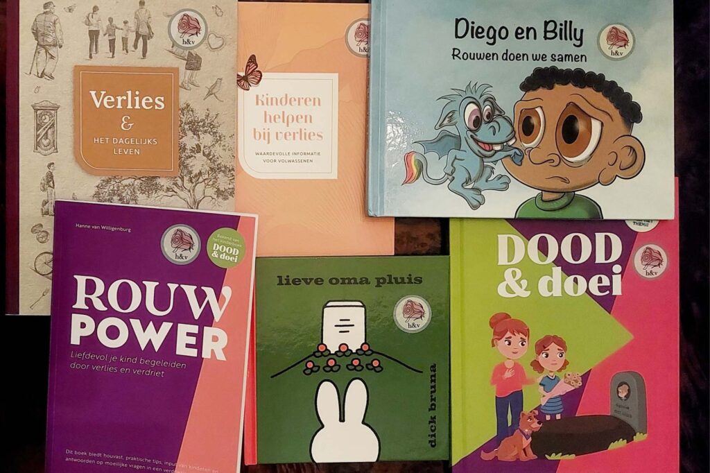 Het gesprek met een kind(eren) kan je met meerdere hulpmiddelen ondersteunen. Ik heb inkijkexemplaren van diverse boeken voor je beschikbaar. Wat ook zeker helpt is het samen kijken naar ‘Afscheid nemen’, een aflevering van Het Klokhuis over dood en afscheid.